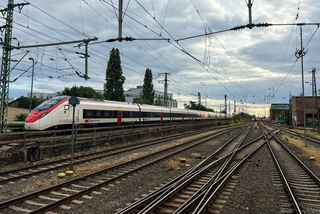 Im Vorfeld des Frankfurter Hauptbahnhof stehen am 26.06.2024 zwei Twindex-Triebwagen.