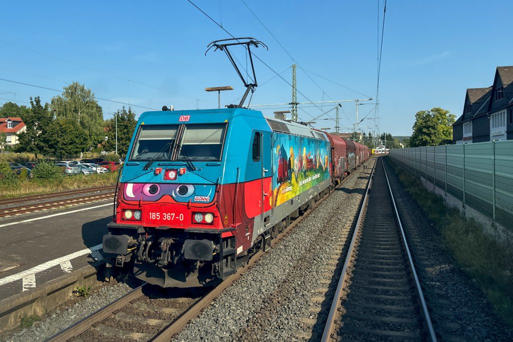 185 367 fährt als Günni mit seinem Güterzug durch den Bahnhof Butzbach auf der Main-Weser-Bahn, aufgenommen am 02.09.2024.