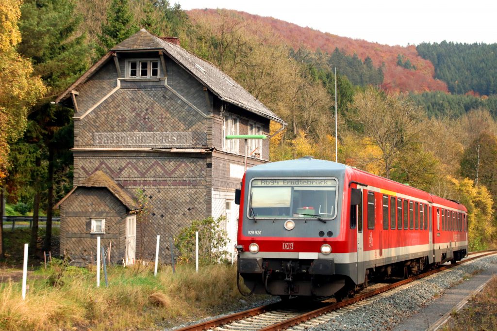 628 526 am alten Bahnhofsgebäude von Sassmanshausen auf der oberen Lahntalbahn, aufgenommen am 17.10.2017.