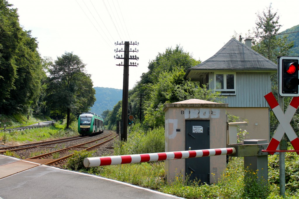 Ein LINT der VECTUS passiert das leer stehende Stellwerk Friedrichsegen Ost in Richtung Limburg auf der Lahntalbahn am 04.08.2014.