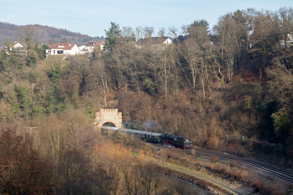 52 1360 verlässt den Weilburger Tunnel auf der Lahntalbahn, aufgenommen am 28.12.2019.