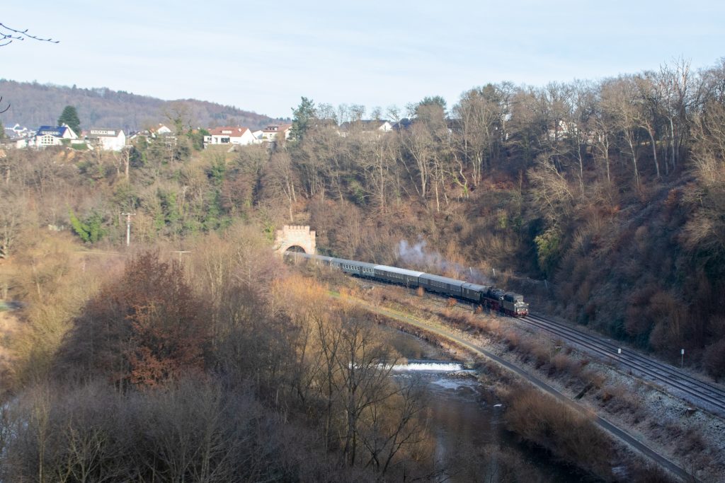 58 311 zieht ihren Sonderzug durch die lange Kurve von Aumenau auf der Lahntalbahn, aufgenommen am 29.12.2018.