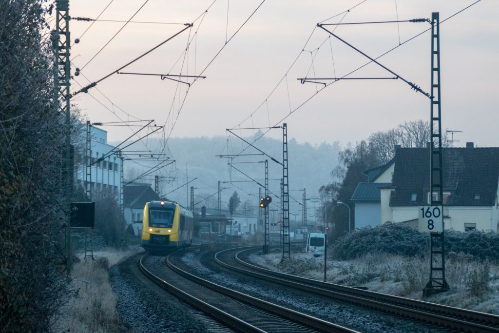 Ein 1622 der HLB verlässt in kühlem Dunst den Bahnhof Dutenhofen auf der Dillstrecke, aufgenommen am 22.11.2025.