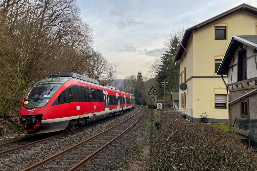 644 053 und zwei weitere 644 an einem Bahnwärterhaus bei Laurenburg auf der Lahntalbahn, aufgenommen am 22.02.2023.