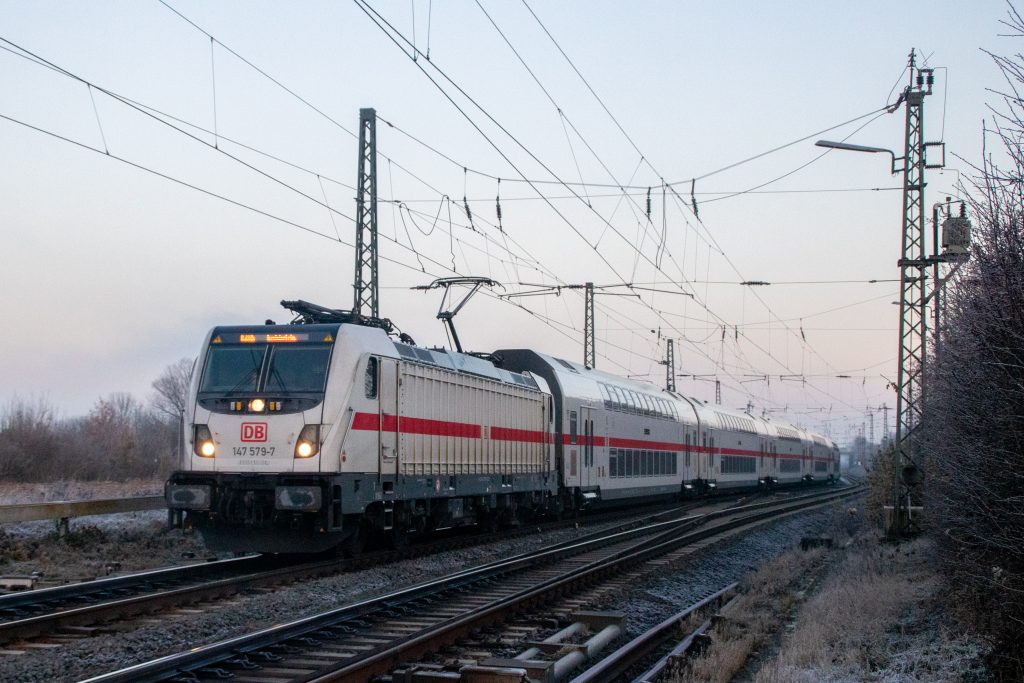 Angeführt von 147 579 fährt der InterCity in den Bahnhof Dutenhofen auf der Dillstrecke, aufgenommen am 22.11.2025.